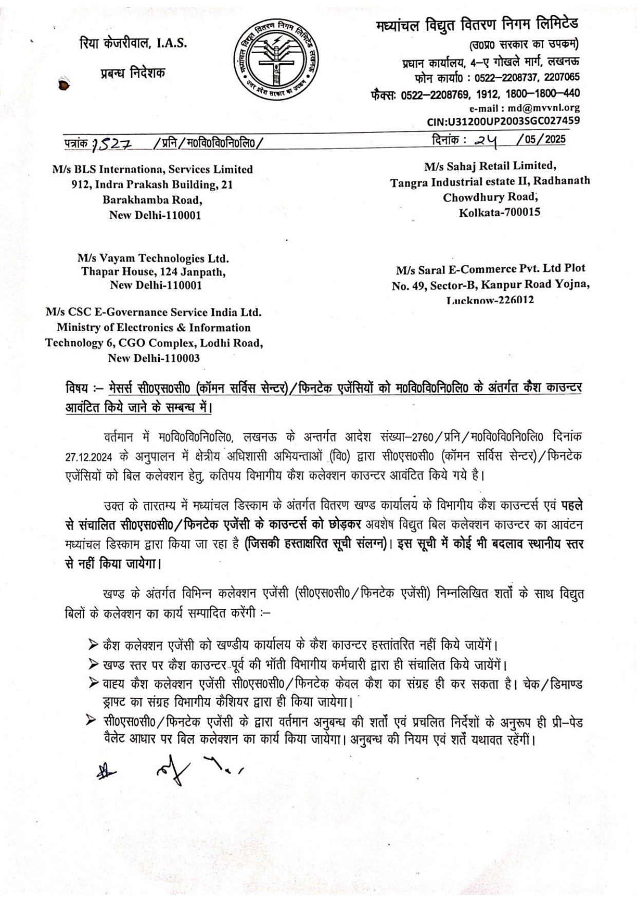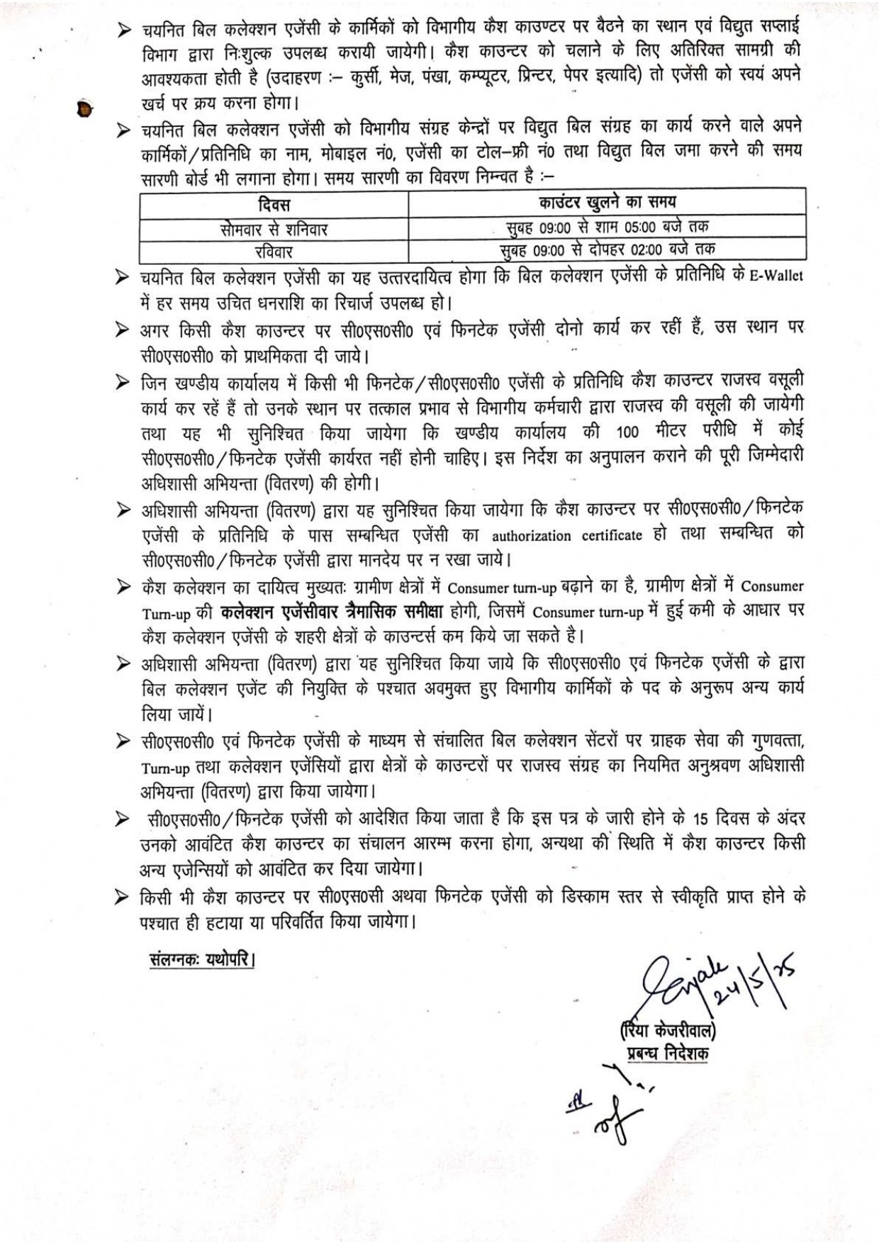 “किसी भी कैश काउंटर पर सीएससी अथवा फिनटेक एजेंसी को डिस्कॉम स्तर से स्वीकृति प्राप्त होने के पश्चात् ही हटाया या परिवर्तित किया जायेगा।”