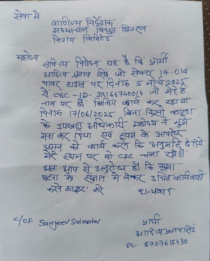 वर्षों से नियमपूर्वक कार्यरत युवक आदित्य प्रताप सिंह, जो आईडी 31166740014 के माध्यम से उपभोक्ता सेवा केंद्र चला रहे थे, को बिना नोटिस एवं बिना कारण 17 जून 2025 को सेवा से बाहर कर दिया गया। इसके स्थान पर तत्कालीन एसडीओ के चहेते संविदाकर्मी अमन को काउंटर आवंटित कर दिया गया, जो कि शासन के दिशा-निर्देशों के प्रतिकूल है।