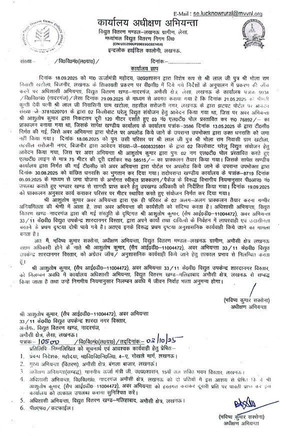 рдКрд░реНрдЬрд╛ рд╡рд┐рднрд╛рдЧ рдореЗрдВ рднреНрд░рд╖реНрдЯрд╛рдЪрд╛рд░ рдФрд░ рдордирдорд╛рдиреА рдХрд╛ рдирдВрдЧрд╛ рдирд╛рдЪ рдЕрдм рдХрд┐рд╕реА рд╕реЗ рдЫрд┐рдкрд╛ рдирд╣реАрдВред рдирд╡реАрдирддрдо рдорд╛рдорд▓рд╛ рд▓рдЦрдирдК рдЧреНрд░рд╛рдореАрдг рд╡рд┐рджреНрдпреБрдд рд╡рд┐рддрд░рдг рдордВрдбрд▓ рдХрд╛ рд╣реИ, рдЬрд╣рд╛рдВ рдЕрд╡рд░ рдЕрднрд┐рдпрдиреНрддрд╛ рдЖрд╢реБрд╖реЛрдд рдХреБрдорд╛рд░┬ардХреЛ рдПрдХ рддрдерд╛рдХрдерд┐рдд тАЬрд▓рд╛рдкрд░рд╡рд╛рд╣реАтАЭ рдХреЗ рдорд╛рдорд▓реЗ рдореЗрдВ рдирд┐рд▓рдВрдмрд┐рдд рдХрд░ рджрд┐рдпрд╛ рдЧрдпрд╛ред