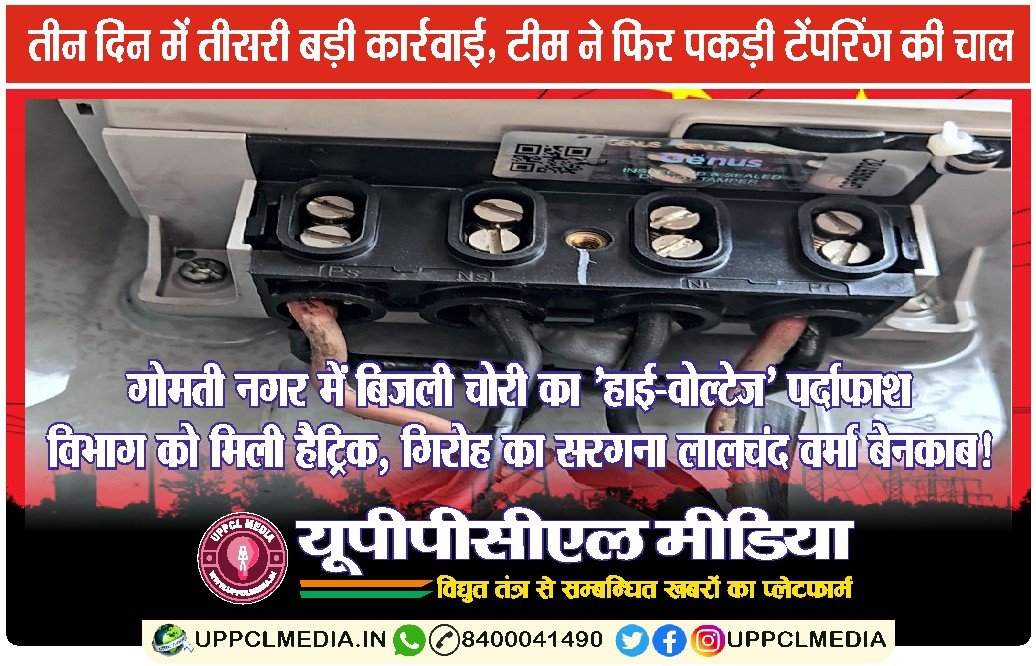 लखनऊ। बिजली चोरी के खिलाफ यूपीपीसीएल की विशेष टीम ने लगातार तीसरी बार बड़ी सफलता हासिल की है। गोमती नगर जोन में आज फिर विभागीय टीम ने छापामारी कर एक संगठित गिरोह का पर्दाफाश किया, जो मीटर में फेज़ और न्यूट्रल वायर में सीधे लूपिंग कर बिजली चोरी कर रहा था।