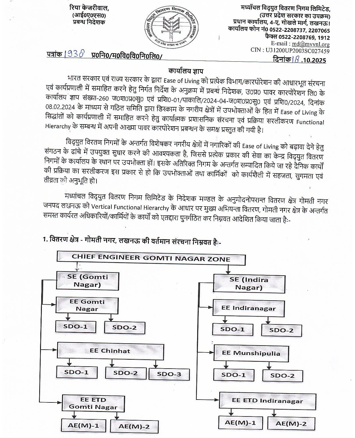🔹 गोमतीनगर ज़ोन वर्टिकल (एकल व्यवस्था) कार्यालय ज्ञापन