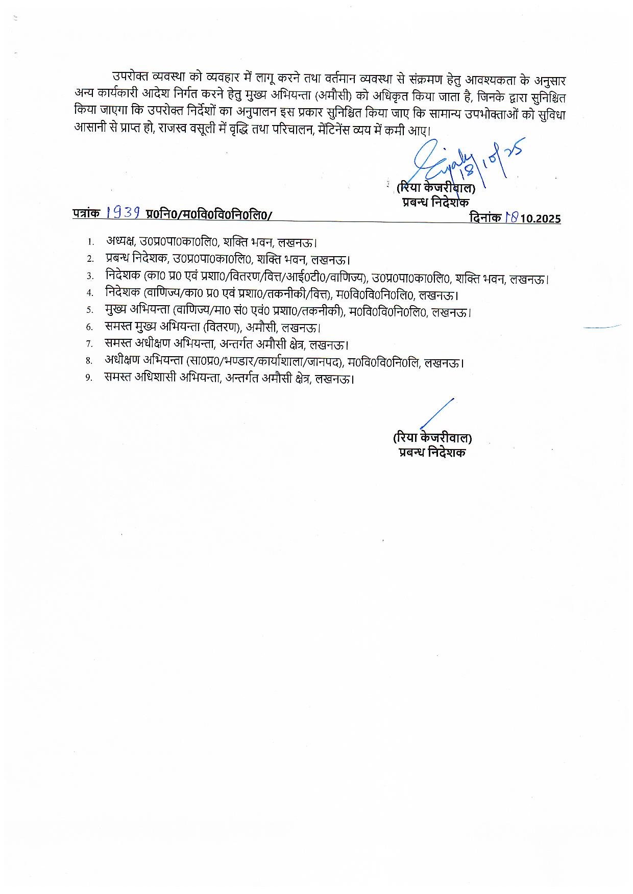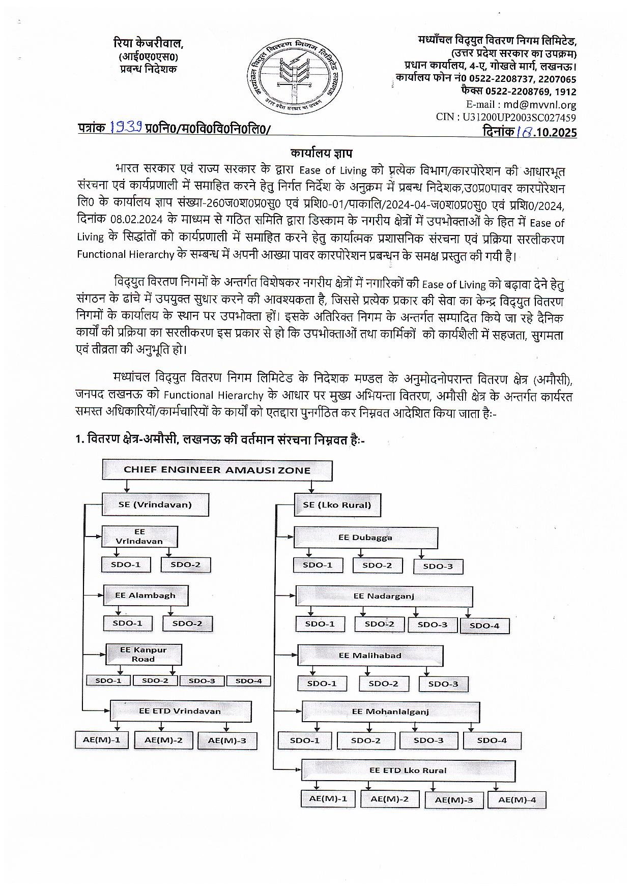 🔹 अमौसी ज़ोन वर्टिकल (एकल व्यवस्था) कार्यालय ज्ञापन
