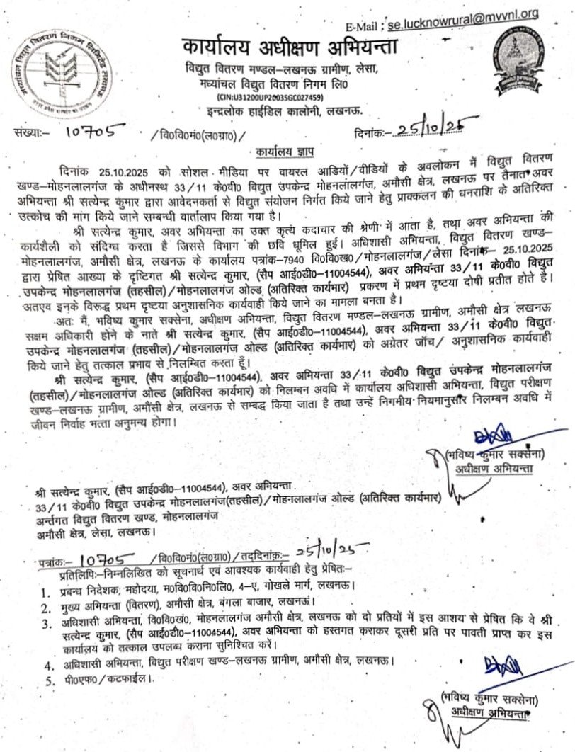 ताजा निलंबन आदेश (संख्या 10705/विविनि(रां)/2025 दिनांक 25.10.2025) स्वयं अधीक्षण अभियंता, विद्युत वितरण मंडल–अमानीगंज, लखनऊ ग्रामीण द्वारा जारी किया गया है। परंतु, नियमों के अनुसार अधीक्षण अभियंता (E.E./S.E.) को इस स्तर की अनुशासनात्मक कार्रवाई करने का कोई अधिकार नहीं है।