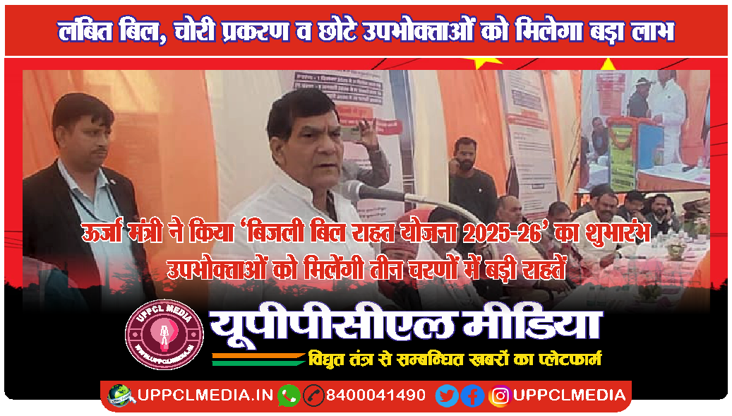 प्रतापगढ़/लखनऊ। उत्तर प्रदेश सरकार द्वारा बिजली उपभोक्ताओं को राहत देने के उद्देश्य से शुरू की गई महत्वाकांक्षी ‘बिजली बिल राहत योजना 2025–26’ का औपचारिक शुभारंभ सोमवार 01 दिसंबर को प्रदेश के ऊर्जा मंत्री ए.के. शर्मा ने प्रतापगढ़ जनपद के कुंडा तहसील स्थित 33/11 केवी विद्युत उपकेंद्र परिसर में किया। उपकेंद्र पर आयोजित उपभोक्ता कैंप में ऊर्जा मंत्री ने ग्रामीण व शहरी उपभोक्ताओं से सीधे संवाद करते हुए उन्हें योजना के विभिन्न प्रावधानों और लाभों की विस्तृत जानकारी दी।