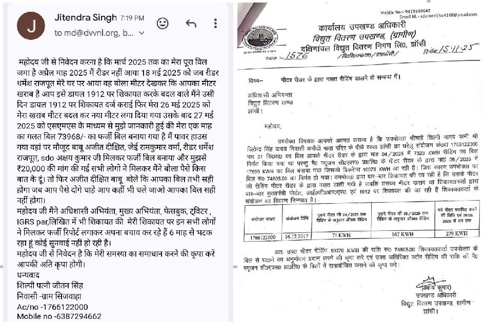 झांसी/सिजवाहा। दक्षिणांचल विद्युत वितरण निगम लिमिटेड (DVVNL) के झांसी क्षेत्र में भ्रष्टाचार का हैरान करने वाला मामला सामने आया है। एक उपभोक्ता का मीटर सरकारी लैब द्वारा “No Display / मीटर खराब” प्रमाणित होने के बावजूद विभाग ने उपभोक्ता पर एक महीने का 73,968 रुपये का फर्जी बिल थोप दिया। फिर बिल सही करने के लिए SDO–JE–रीडर ने मिलकर ₹20,000 की रिश्वत माँगी, ऐसा आरोप पीड़ित ने अपनी लिखित शिकायतों में लगाया है।