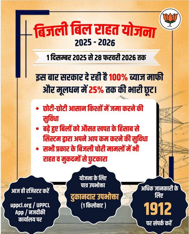उत्तर प्रदेश सरकार की बहुचर्चित बिजली राहत योजना 2025–26 को आम उपभोक्ताओं के लिए बड़ी सौगात के रूप में प्रचारित किया जा रहा है। योजना का संचालन उत्तर प्रदेश पावर कॉरपोरेशन लिमिटेड द्वारा किया जा रहा है, जिसमें 100 प्रतिशत सरचार्ज माफी, मूलधन में चरणबद्ध छूट और किस्तों पर अतिरिक्त रियायत देने की घोषणा की गई है।