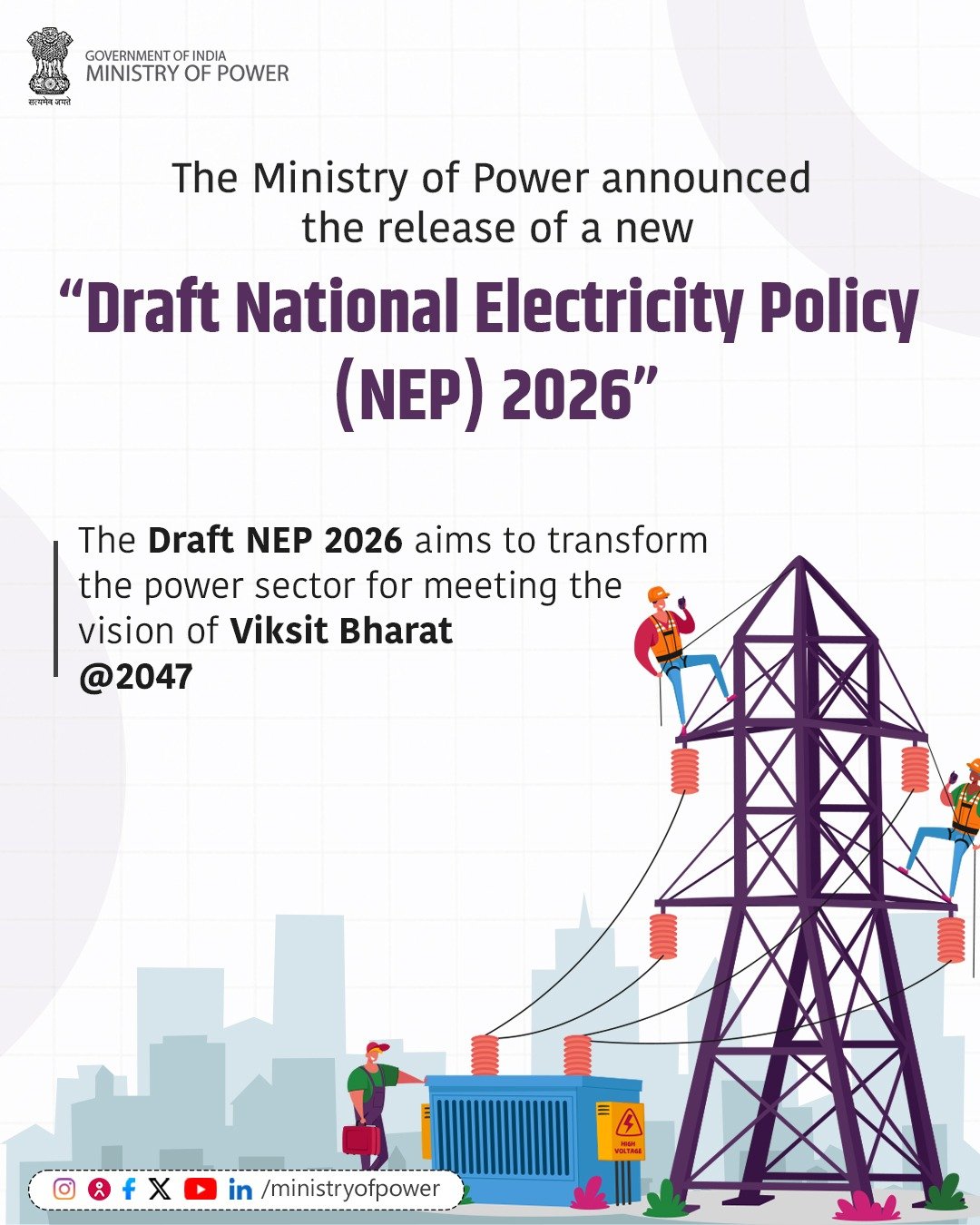 नई दिल्ली। विद्युत मंत्रालय ने राष्ट्रीय विद्युत नीति–2026 का नया मसौदा जारी कर दिया है। इस नीति का उद्देश्य विकसित भारत–2047 के लक्ष्य को साकार करने के लिए देश के विद्युत क्षेत्र में व्यापक और दूरगामी सुधार करना है।