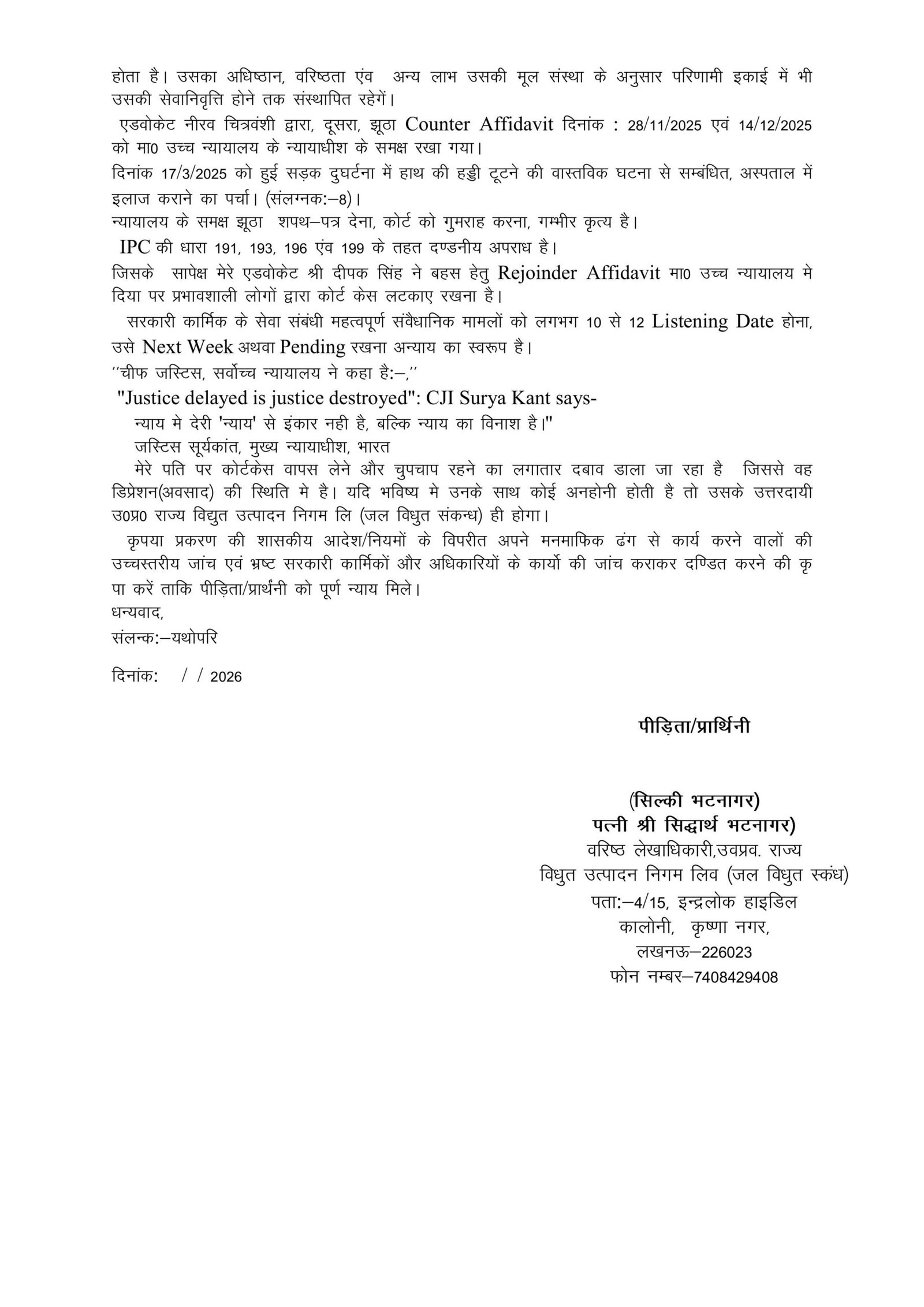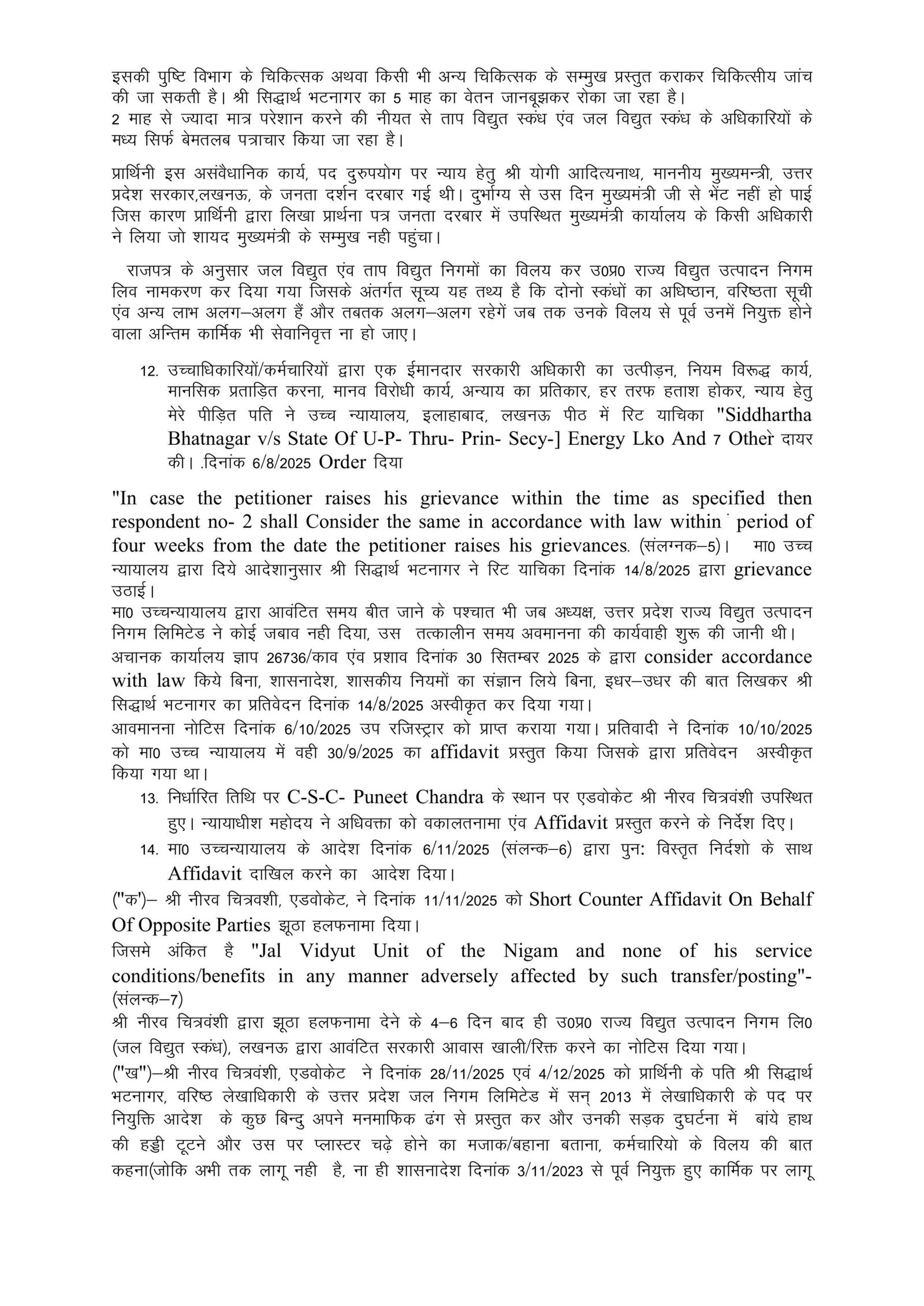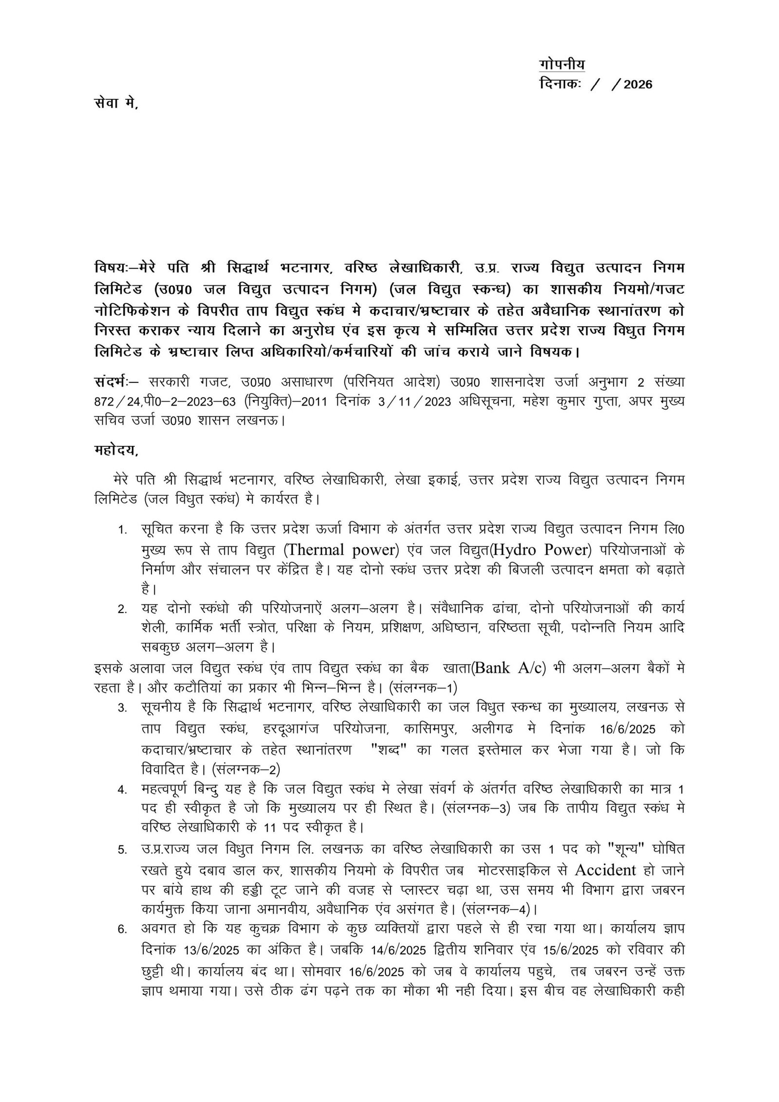 उत्तर प्रदेश राज्य विद्युत उत्पादन निगम लिमिटेड (UPRVUNL) से जुड़ा एक मामला सामने आया है, जिसमें वरिष्ठ लेखाधिकारी सिद्धार्थ भटनागर के साथ विभागीय स्तर पर कथित अनियमितता और उत्पीड़न का आरोप लगाया गया है। इस संबंध में उनकी पत्नी ने शासन को विस्तृत प्रार्थना-पत्र भेजकर जांच और न्याय की मांग की है।