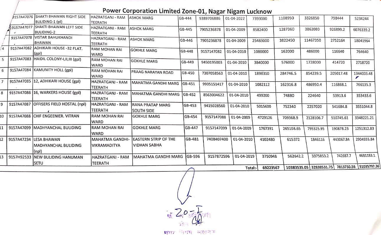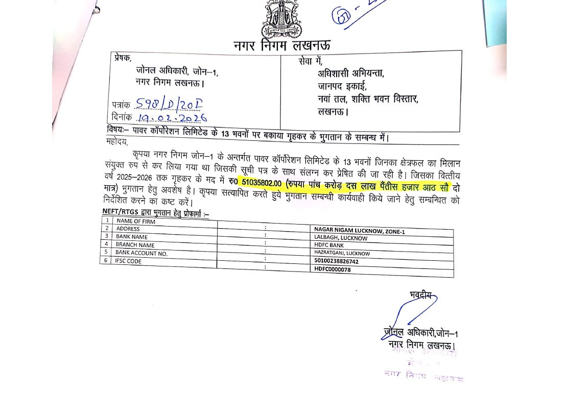 नगर निगम लखनऊ के जोन-1 से जारी आधिकारिक पत्र के अनुसार पावर कॉरपोरेशन लिमिटेड के 13 भवनों पर कुल ₹5,01,35,577.36 (करीब पाँच करोड़ रुपये) का हाउस टैक्स बकाया चल रहा है। नगर निगम ने अधिशासी अभियंता को पत्र लिखकर बकाया राशि का भुगतान कराने के निर्देश दिए हैं।