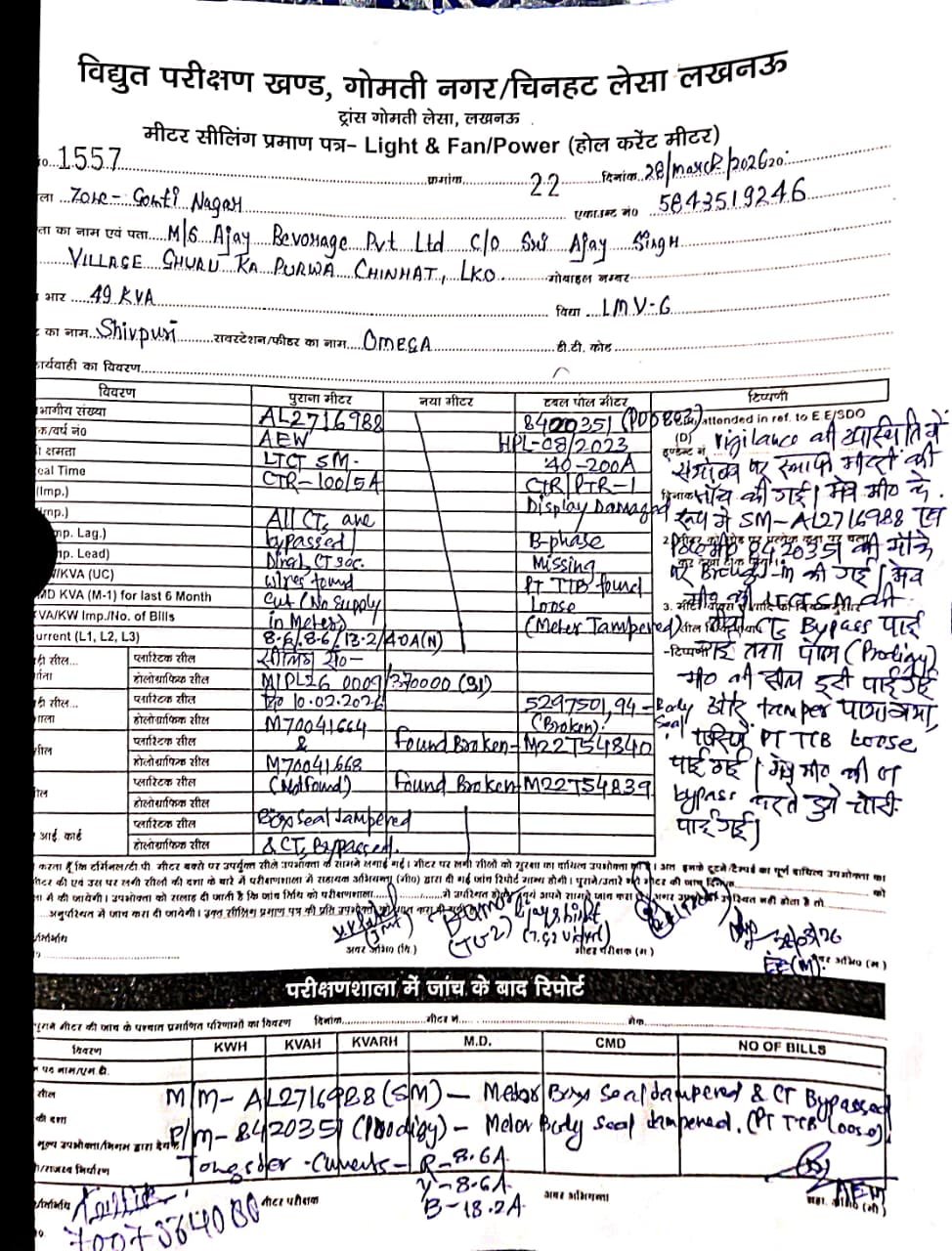 मौके पर जांच में यह स्पष्ट हुआ कि मीटर की CT को पूरी तरह बायपास कर सीधे सप्लाई ली जा रही थी, जिससे वास्तविक खपत का बड़ा हिस्सा मीटर में दर्ज ही नहीं हो रहा था। इसके साथ ही मीटर बॉक्स और बॉडी सील को तोड़कर टेम्परिंग की गई थी और डिस्प्ले को डैमेज कर रीडिंग छुपाने की कोशिश की गई। B-Phase मिसिंग और करंट में भारी असंतुलन भी पाया गया, जो तकनीकी छेड़छाड़ का स्पष्ट संकेत है। जांच रिपोर्ट में साफ उल्लेख किया गया कि “All CTs Bypassed”, यानी पूरा मीटरिंग सिस्टम जानबूझकर निष्क्रिय किया गया था।