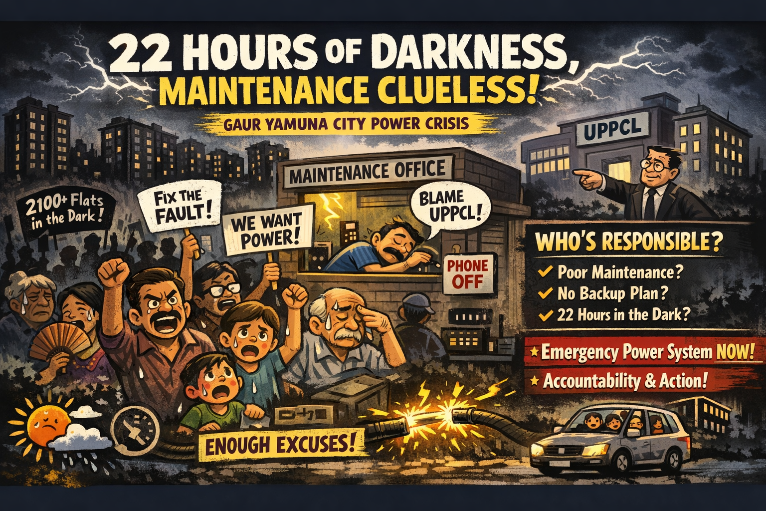 ⚡ 22 घंटे अंधेरा, मेंटेनेंस बेखबर! — गौर यमुना सिटी में बिजली संकट पर फूटा गुस्सा